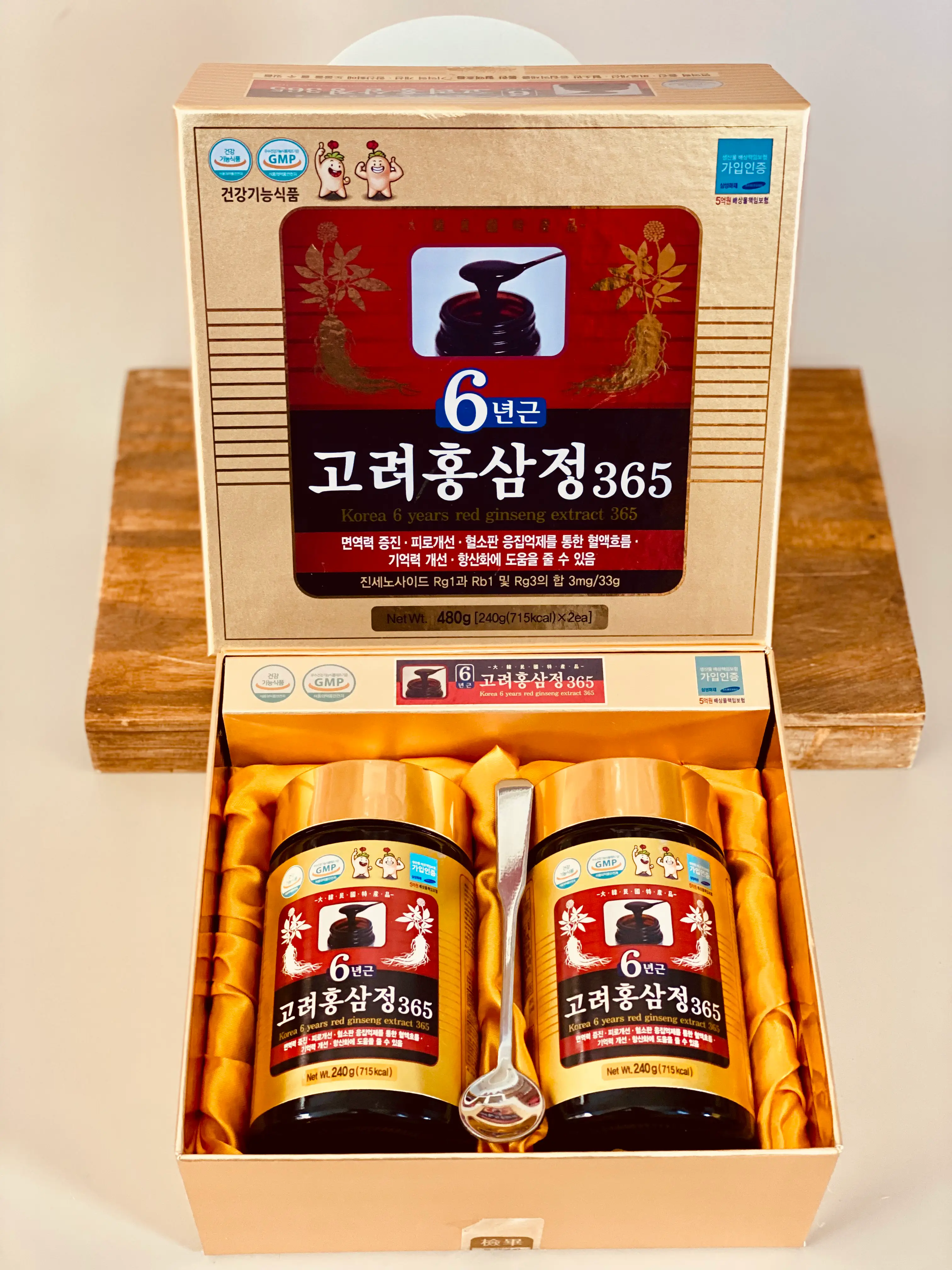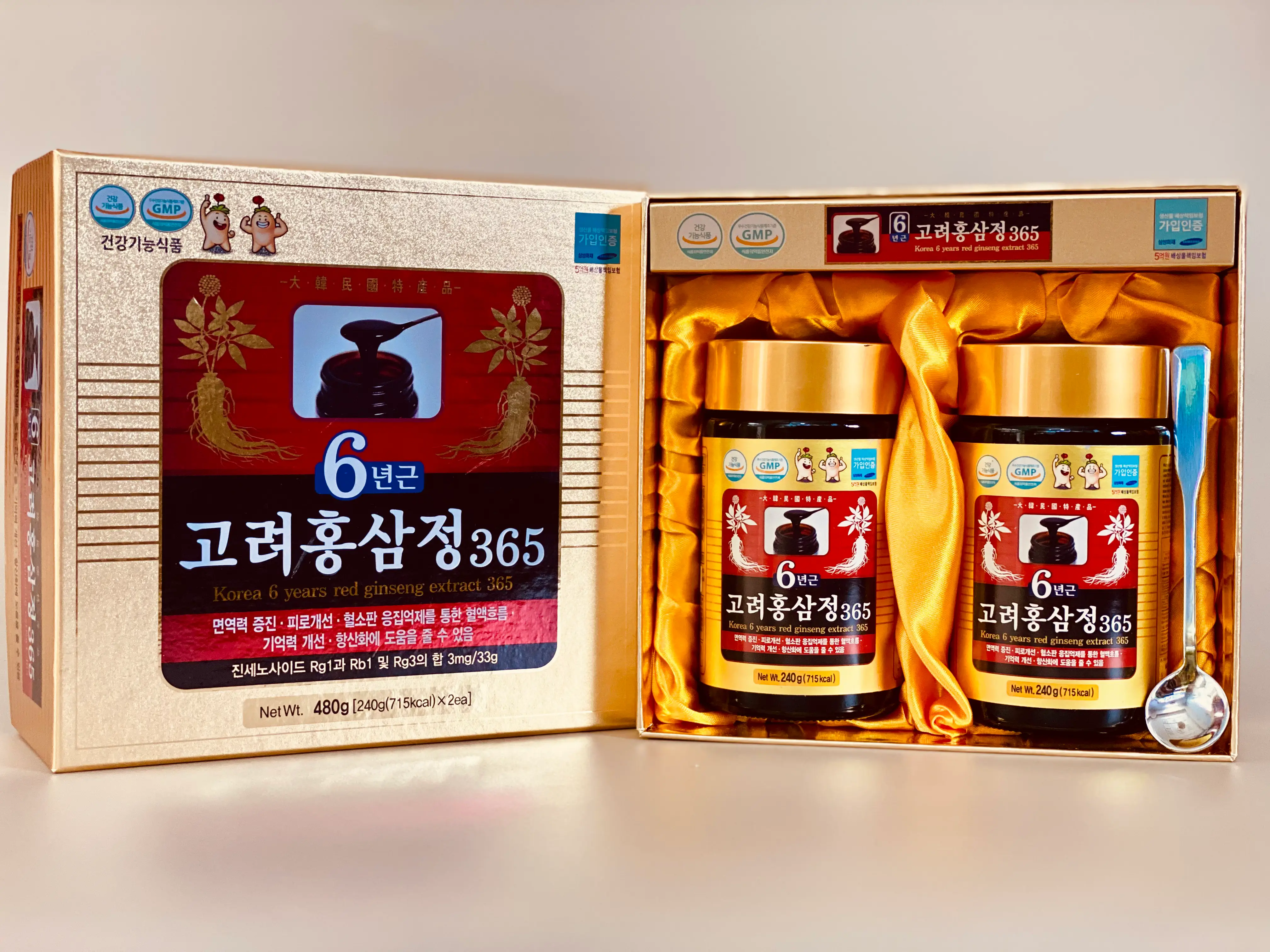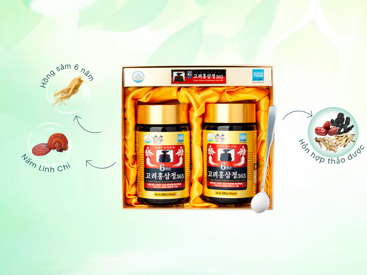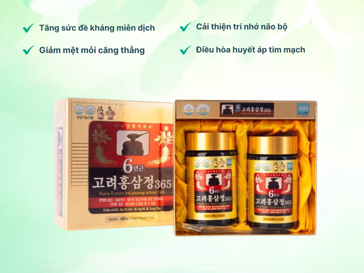 Cao hồng sâm 365 Red Ginseng Extract 2 lọ 240g là sản phẩm được tinh chế từ hồng sâm Hàn Quốc 6 năm tuổi kết hợp cùng thảo dược quý, giàu ginsenoside và dưỡng chất bồi bổ sức khỏe. Sản phẩm giúp tăng cường miễn dịch, giảm mệt mỏi, cải thiện tuần hoàn máu và trí nhớ, phù hợp cho người trưởng thành và người cao tuổi. Được phân phối chính hãng bởi Vitamax.vn – đơn vị uy tín trong lĩnh vực thực phẩm bổ trợ sức khỏe, đây là lựa chọn lý tưởng để chăm sóc bản thân và làm quà tặng sức khỏe cho người thân.