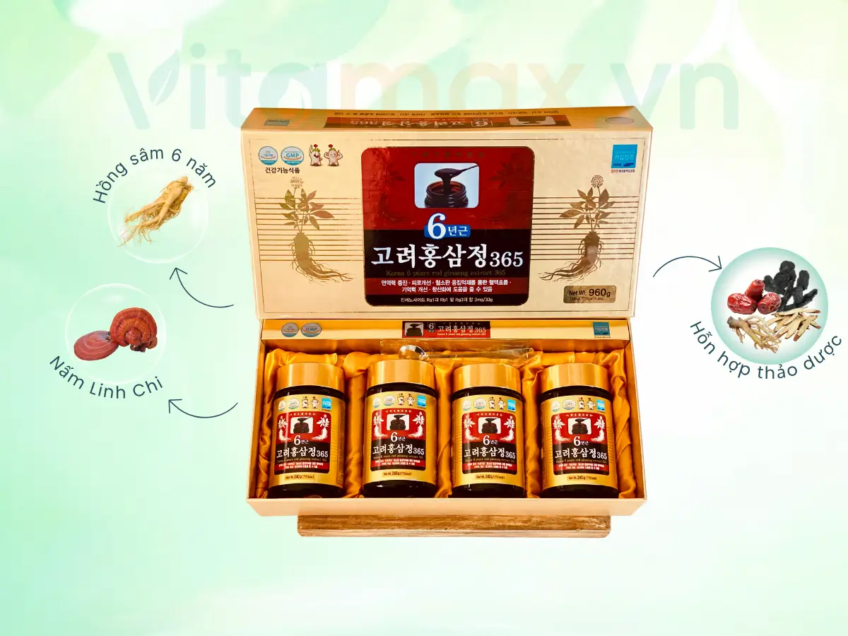 Cao Hồng Sâm 365 Hàn Quốc hộp 4 hũ x 240g là sản phẩm cao cấp được tinh chế từ hồng sâm 6 năm tuổi chính hãng, kết hợp cùng các thảo dược quý như linh chi, đương quy, bạch chỉ, xuyên khung. Sản phẩm này tập trung tối đa các dược tính của nhân sâm Hàn Quốc, đồng thời giữ nguyên hàm lượng Saponin.