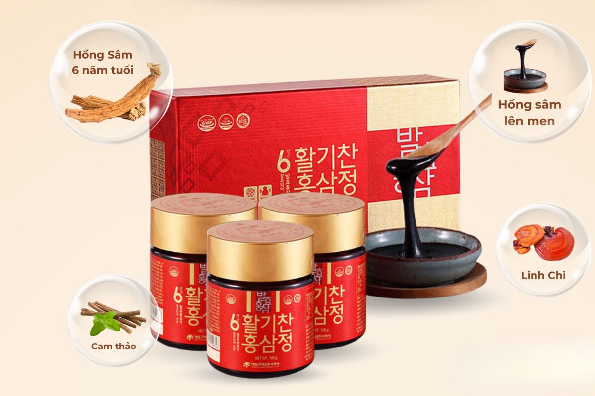 - Cao Hồng Sâm lên men 6 năm tuổi (10%): Thành phần rắn 60%, hàm lượng ginsenoside Rg1 + Rb1 + Rg3 đạt 4 mg/g; quá trình lên men bằng vi khuẩn có lợi giúp chuyển hóa thành Compound K, dễ hấp thu hơn.