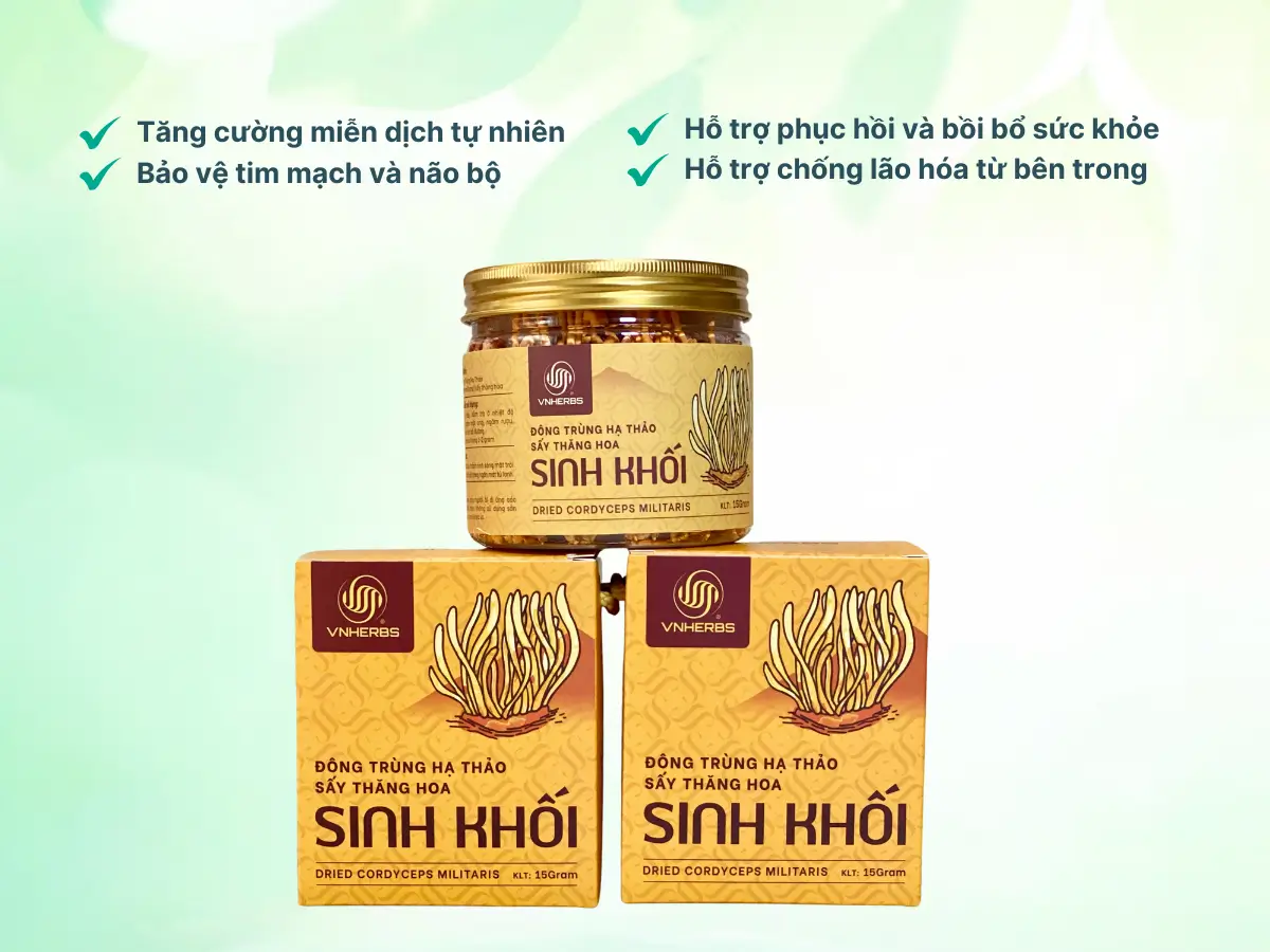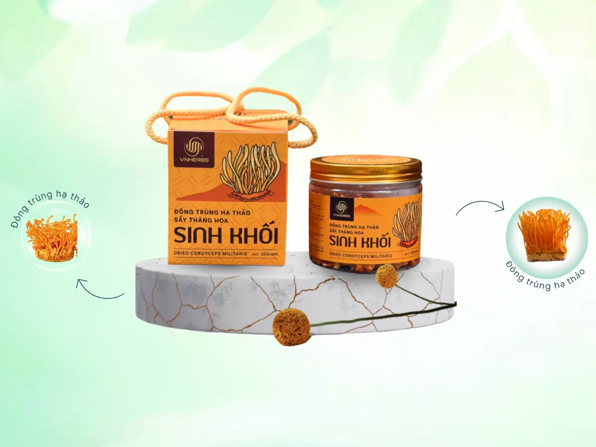 Đông trùng hạ thảo khô sấy thăng hoa Vnherbs mang đến tinh túy từ thiên nhiên với công nghệ hiện đại, giàu Cordycepin và Adenosine - những hoạt chất quý hiếm giúp tăng cường sức đề kháng và hỗ trợ phục hồi sức khỏe toàn diện.