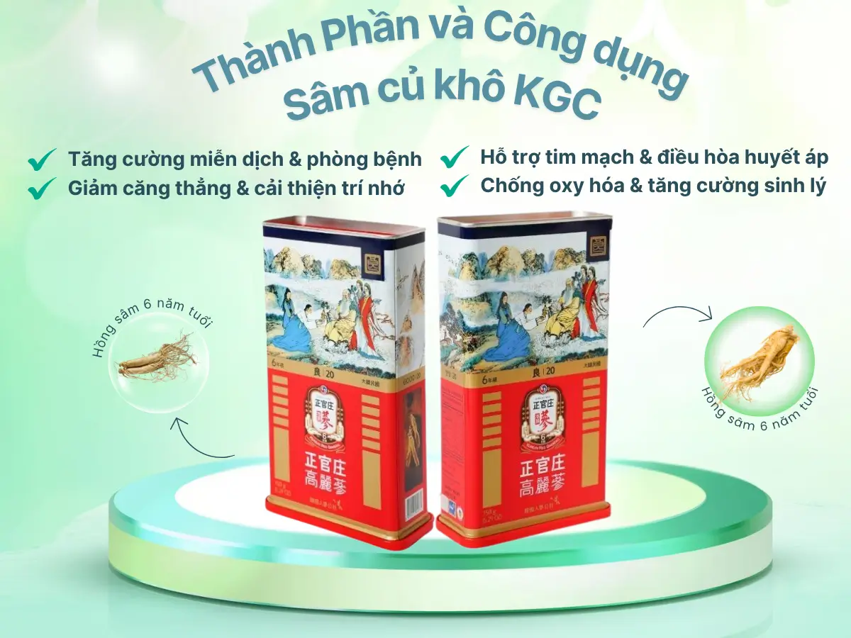 Hồng sâm củ khô 6 năm tuổi KGC số 20 là dòng sản phẩm cao cấp của Korea Ginseng Corporation (Cheong Kwan Jang) – thương hiệu nhân sâm chính phủ Hàn Quốc danh tiếng hơn 120 năm. Nhờ quy trình hấp sấy 9 lần, kiểm định 290 tiêu chí nghiêm ngặt, hồng sâm KGC mang đến hàm lượng ginsenoside cao, tất cả đều được phân phối chính hãng tại Vitamax