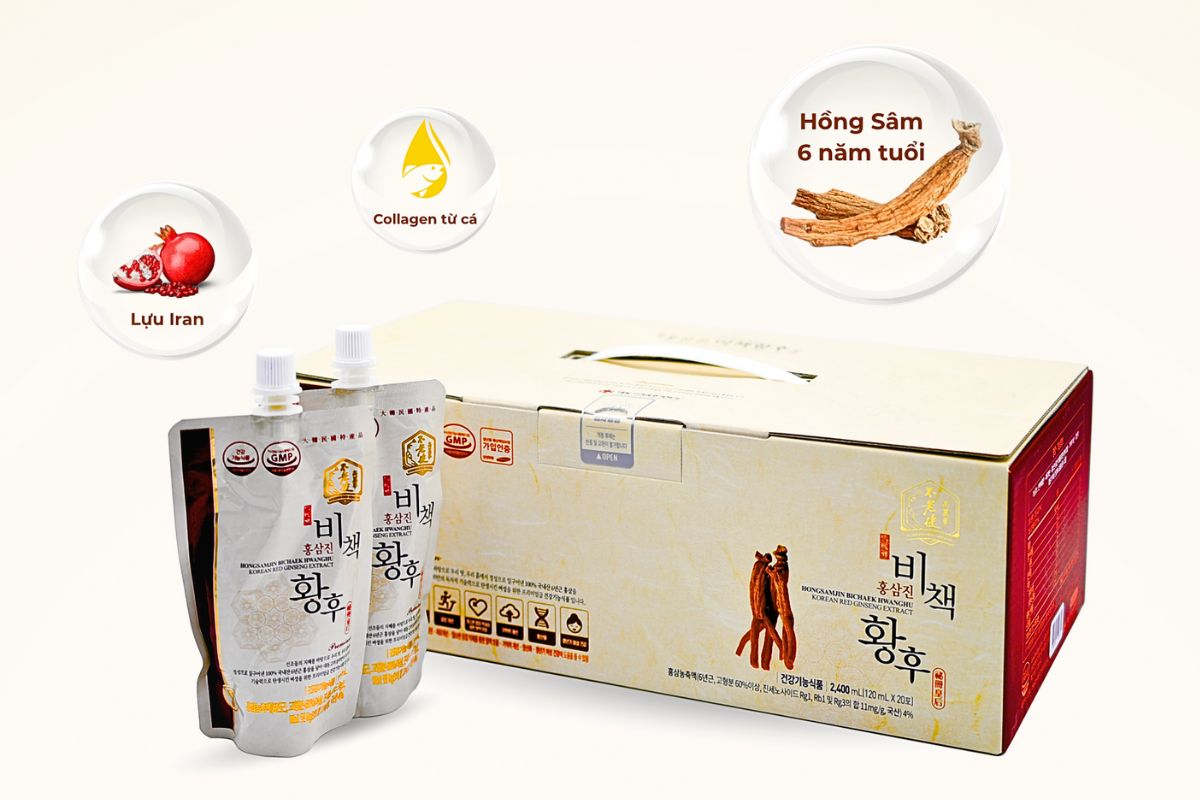 - Chiết xuất hồng sâm 6 năm tuổi cao cấp với hàm lượng Ginsenoside đạt 11mg/g, giúp làm chậm lão hóa và tăng cường sức khỏe toàn diện
