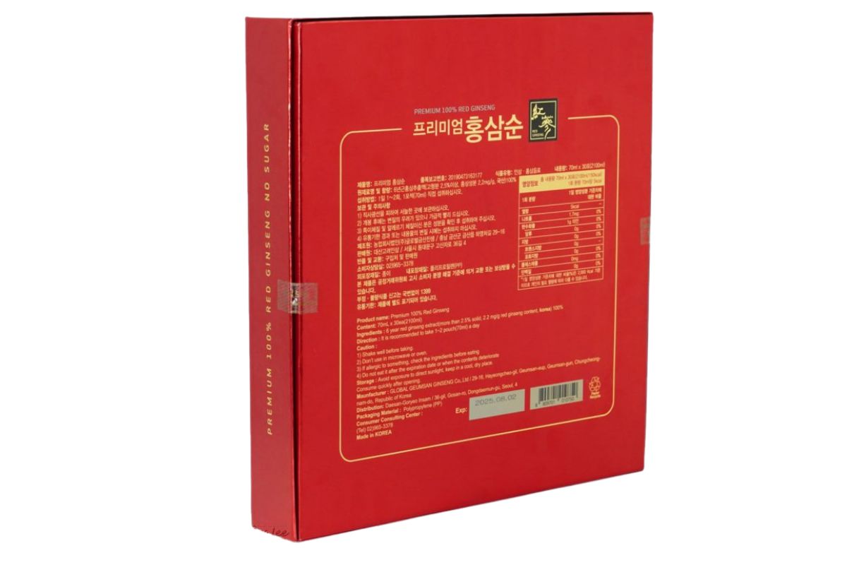 Khác với nhiều loại nước hồng sâm Hàn Quốc dạng gói khác, Daesan hoàn toàn không pha thêm đường tinh luyện, hương liệu hay chất bảo quản. Đây là lựa chọn phù hợp cho người tiểu đường, người ăn kiêng hoặc bất kỳ ai muốn phòng ngừa rối loạn chuyển hóa.