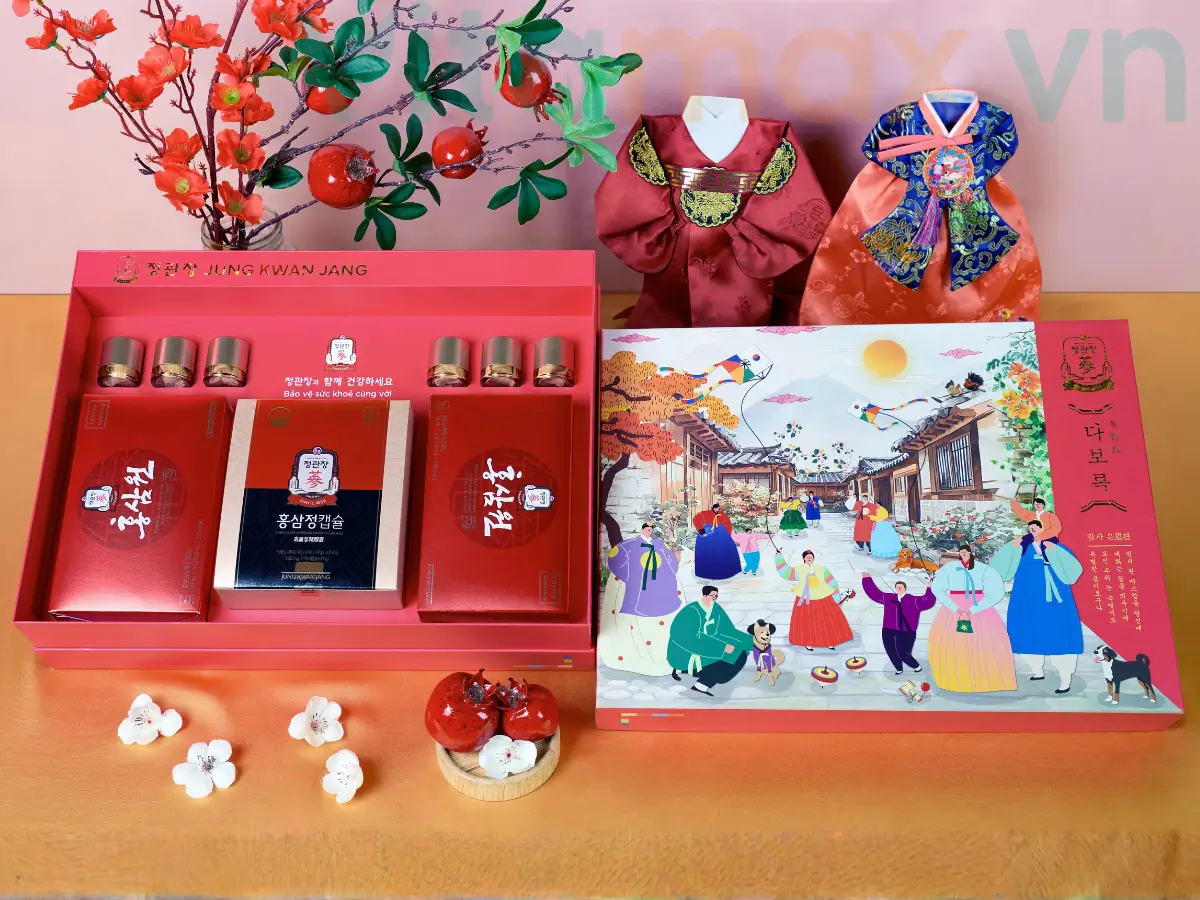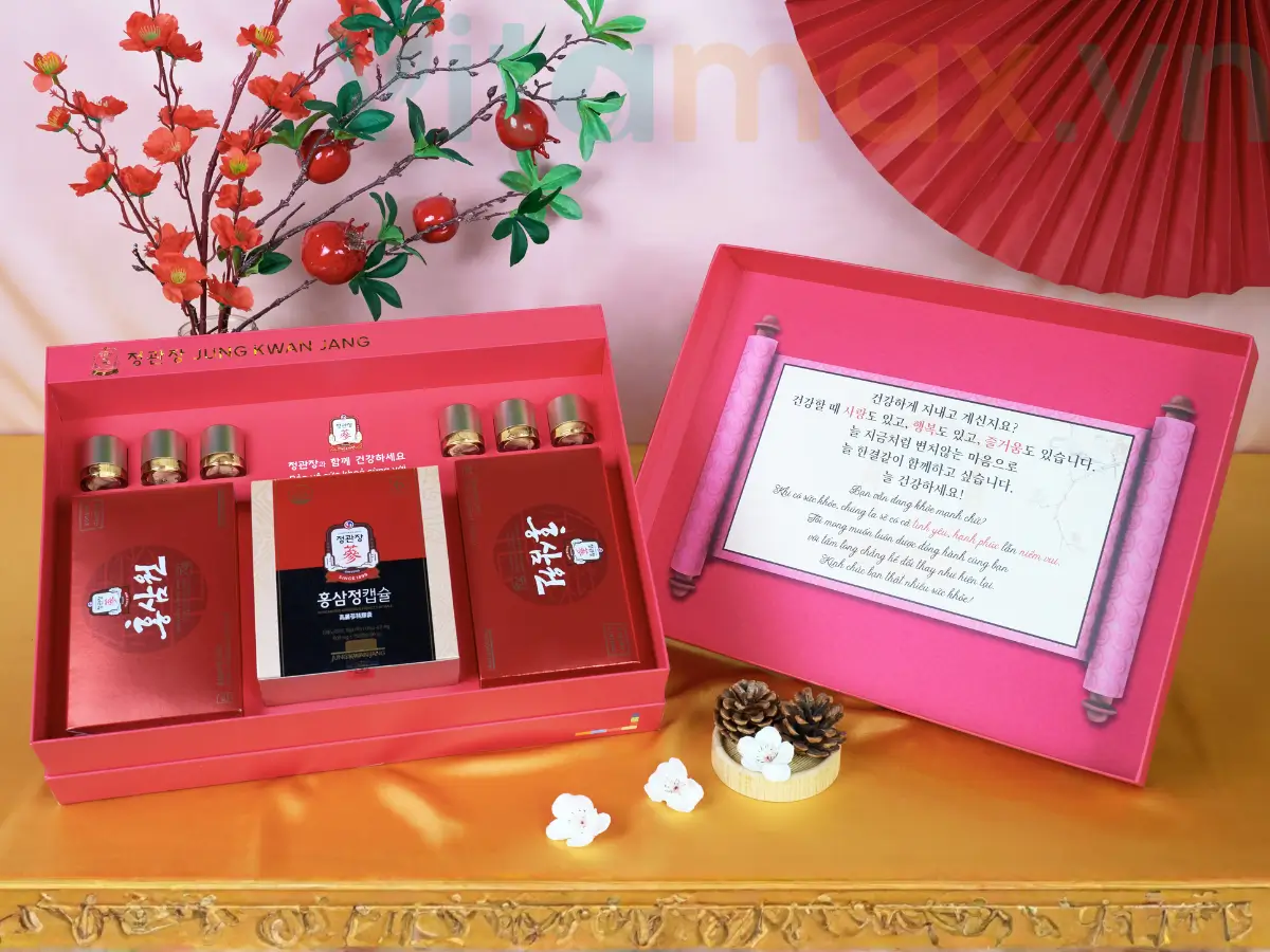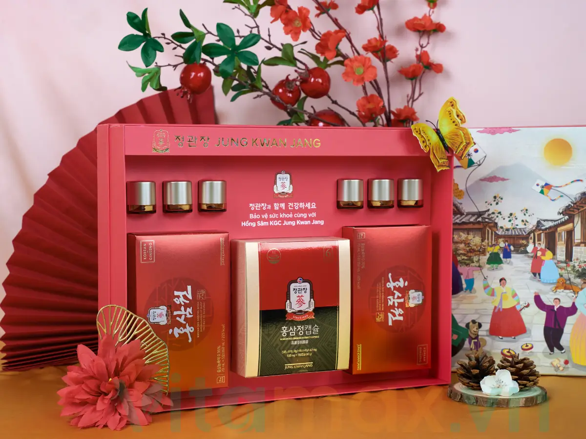 - Thiết kế sang trọng chuẩn quà biếu: KGC Jung Kwan Jang 120 năm, tông đỏ vàng may mắn, họa tiết truyền thống tinh tế