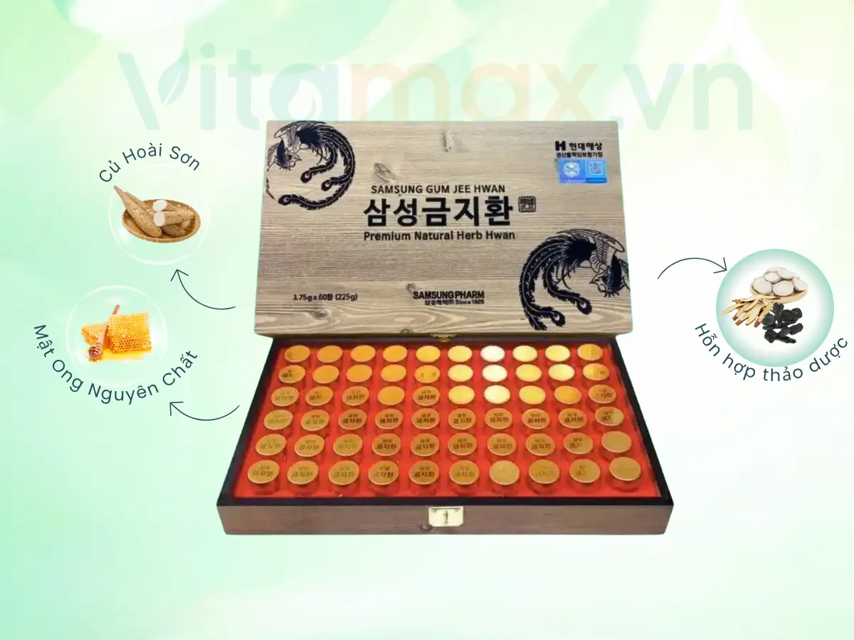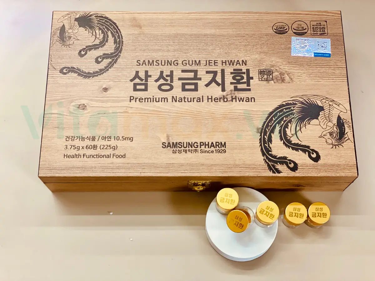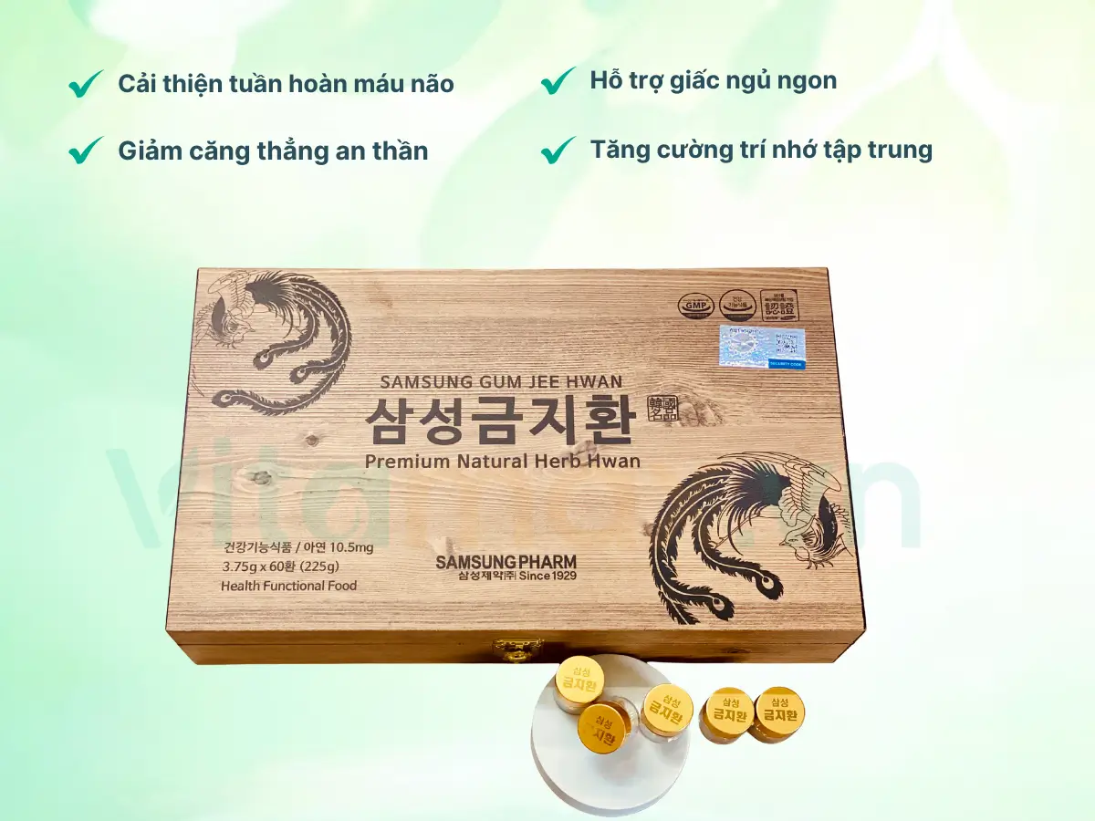 Viên Bổ Não Samsung Gum Jee Hwan Hộp Gỗ 60 Viên là sản phẩm thảo dược cao cấp được sản xuất bởi Samsung Pharmaceutical Co., Ltd (Samsung Pharm) tại Hàn Quốc, kết hợp tinh hoa y học cổ truyền Đông y và công nghệ hiện đại. Sản phẩm này được bào chế từ hơn 20 thành phần dược liệu quý hiếm như Hồng sâm Hàn Quốc, Nhung hươu, Ngưu hoàng, Cam thảo, Hoài sơn và Mật ong. Samsung Gum Jee Hwan trở thành giải pháp tin cậy giúp hỗ trợ phòng ngừa đột quỵ, tai biến mạch máu não, cải thiện tuần hoàn máu não và tăng cường trí nhớ cho người trung niên và cao tuổi.