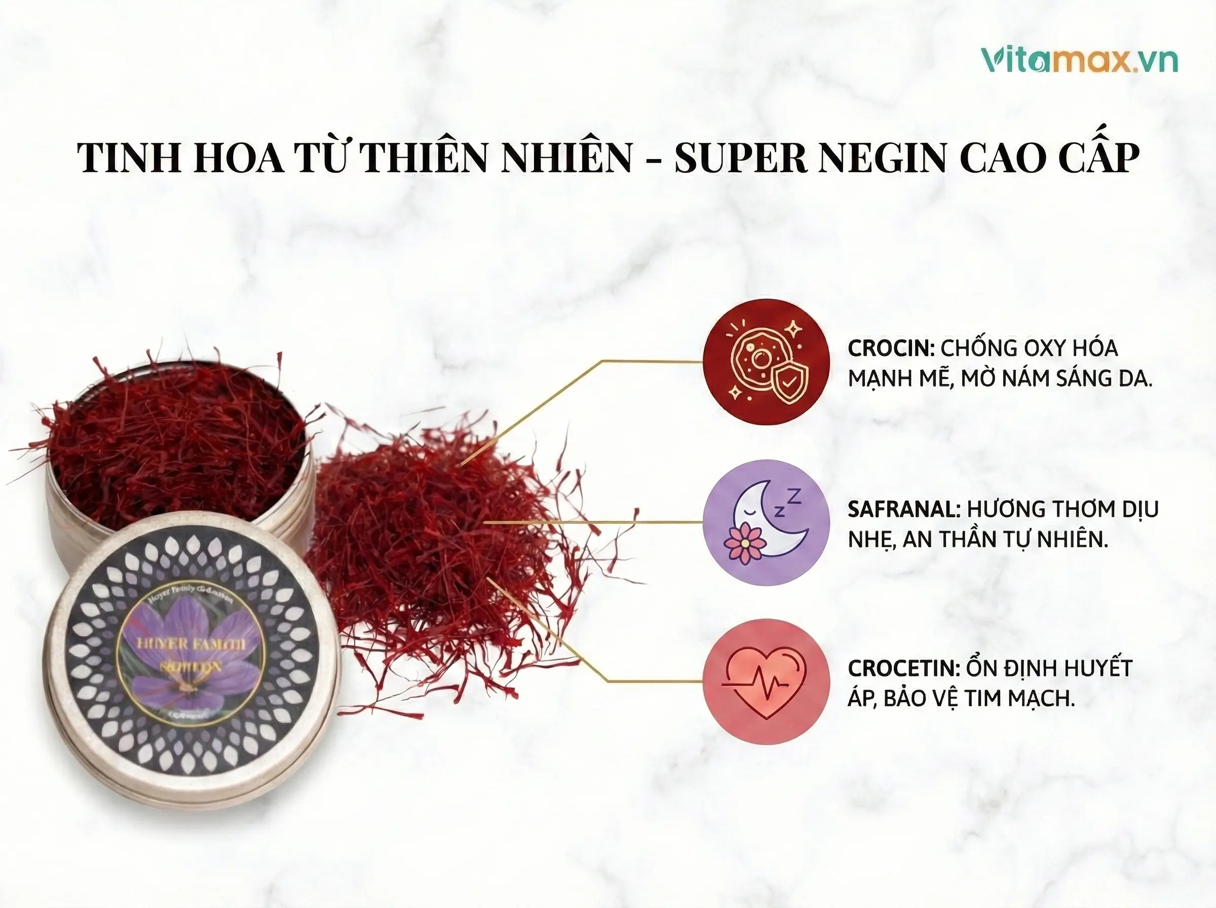 - Hạng Super Negin cao cấp - Chỉ số Crocin 280+, Picrocrocin 100+, Safranal 30+ vượt tiêu chuẩn ISO 3632 Grade 1, thu hoạch thủ công từ Herat, Afghanistan