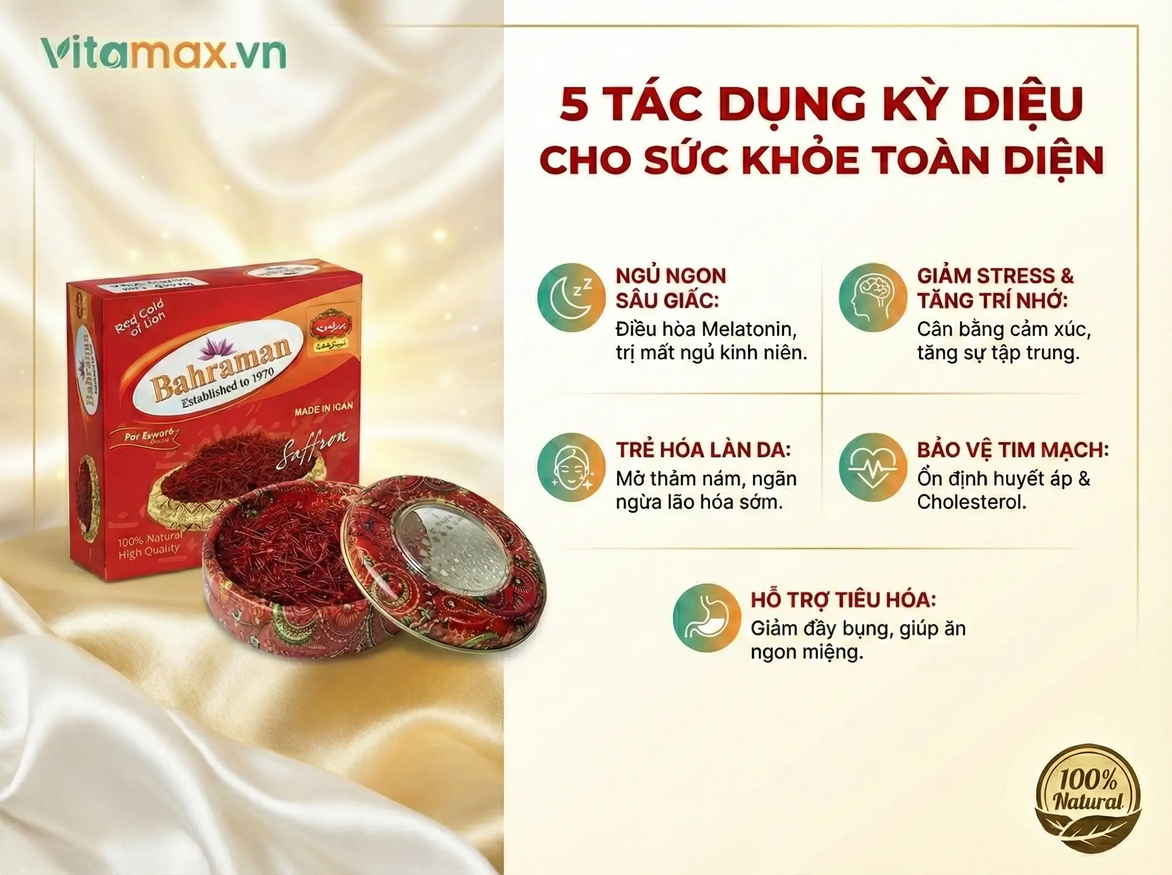 - Hỗ trợ ngủ ngon, giảm stress - Chứa Safranal và Crocin tự nhiên giúp thư giãn, cải thiện giấc ngủ